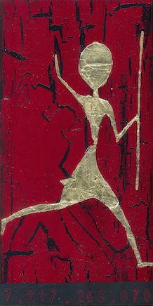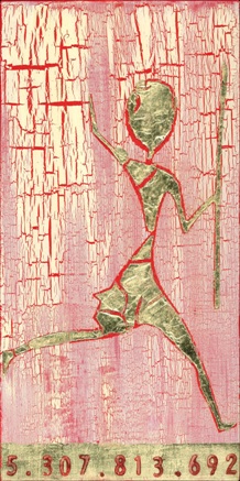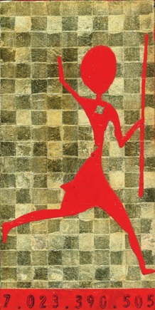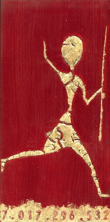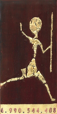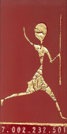 No. 830 Bevölkerungszahl vom:01.02.2013 Mischtechnik auf Holzkasten, 2013 Acryl, Blattmetall 40x20x6 Diesen Läufer anfragen