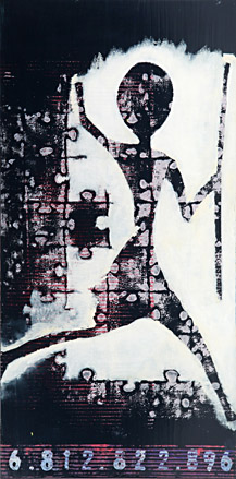No. 862 Bevölkerungszahl vom:07.01.2013 Mischtechnik auf Holzkasten, 2013 Acryl 40x20x6 Diesen Läufer anfragen